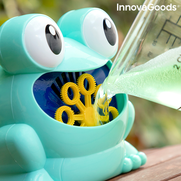 Una divertida máquina de pompas de jabón eléctrica con forma de rana ideal para entretener y ambientar fiestas y celebraciones, especialmente para niños. Esta simpática ranita es capaz de emitir más de 500 pompas de jabón por minuto, además, es muy fácil de usar, sólo hay que introducir el líquido para burbujas en el interior de su boca y presionar el botón de encendido para ver salir de inmediato multitud de pompas. Se puede utilizar con jabones específicos para pompas (no incluido) o con jabón fabricado por uno mismo siguiendo las instrucciones incluidas.